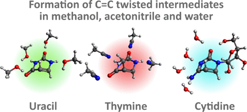This study investigates solvent effects on the formation of ground-state twisted intermediates recently found in the electronic relaxation of uracil and thymine [Obara et al., J. Am. Chem. Soc. 2025, 147, 15077]. We newly identify a similar reaction intermediate characterized by a twisted C5=C6 bond for aqueous cytidine, establishing a structural motif common to all pyrimidine nucleobases and their derivatives. Unlike uracil and thymine, the cytidine intermediate lacks a blue-shifted band in its IR spectrum associated with C=O stretching, precluding its identification using the same spectral criteria applied to uracil and thymine. Nevertheless, quantum chemical calculations assuming a twisted geometry reproduce the experimental IR spectrum, notably identifying the 1580 cm-1 band previously misassigned to the 1nπ* state of cytidine as the marker band for the twisted intermediate. The marker band appears within 1 ps after UV excitation in polar protic solvents such as water and methanol, indicating that the twisted intermediate is generated directly from the 1ππ* state via ultrafast internal conversion through the ethylenic conical intersection. The polar aprotic solvent acetonitrile suppresses the formation of the twisted intermediate and increases the yield of the 3ππ* state for uracil and thymine. The primary difference between protic and aprotic solvents arises from the destabilization of the 1nπ* state in the former. The complexity of solvent effects warrants detailed theoretical modeling to elucidate the interplay between the solute and solvent in nonadiabatic dynamics in solution.